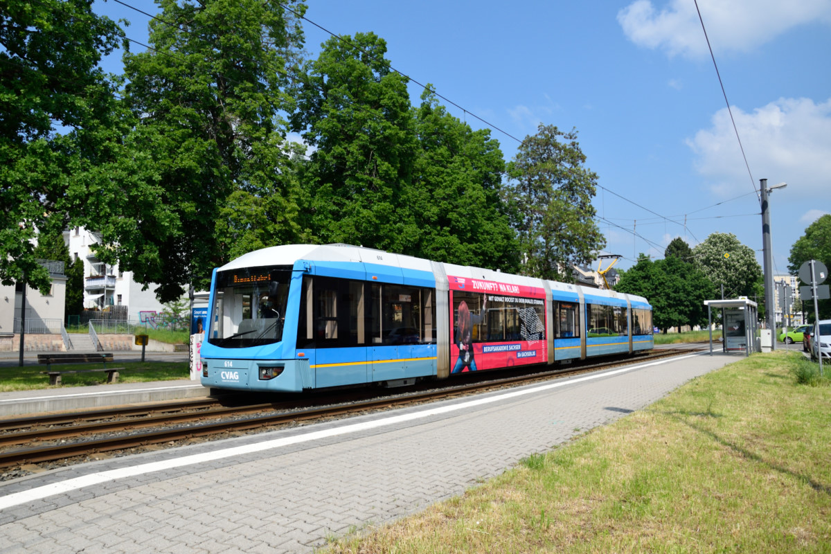 614 verlässt die Haltestelle Ikarus auf der Stollberger Straße